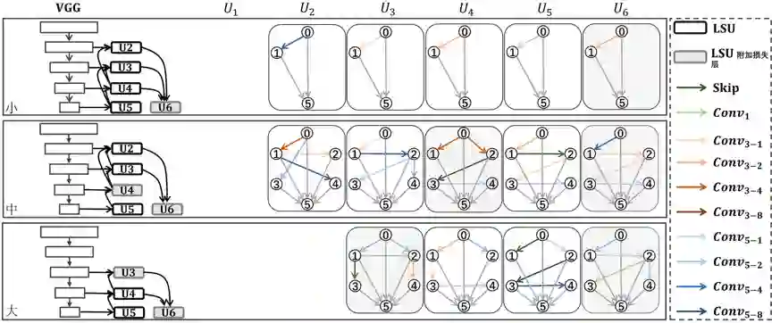 具体而言,我们提出了一个基于神经结构搜索技术的方法,称为自适应线性扩张网络(AdaLSN)。该方法为骨架检测任务配置和融合具有尺度感知特性的特征表示。自适应线性扩张网络方法的主体是一种混合了线性扩张单元和线性扩张金字塔的神经网络搜索空间。这种搜索空间的设计超越了许多仅使用单元级或特征金字塔级的搜索空间,见图1。在混合空间内,我们应用遗传结构搜索算法以联合优化单元级操作和用于自适应特征空间扩展的金字塔级连接,见图2。自适应线性扩张网络相比最先进方法能自动搜索到性能更优越的网络结构,见图3和表1。我们还将其应用在其他图像掩模生成任务上,生成结果均接近标注真值,验证了本方法的普遍适用性,见图4和图5。