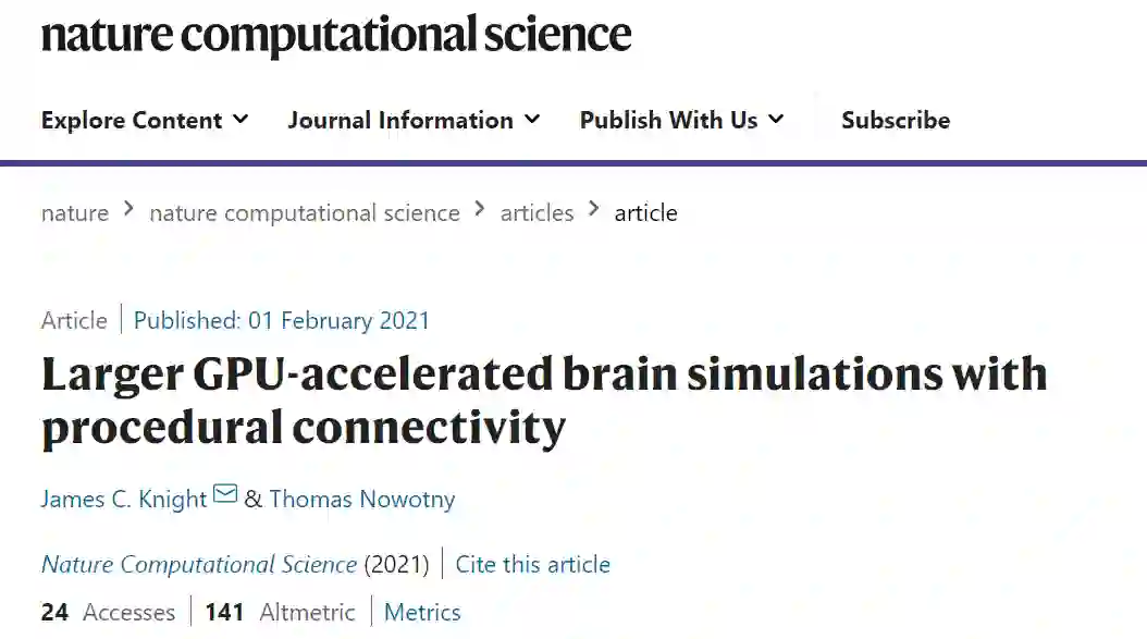 通常来说,这种级别的大脑模拟需要超级计算机来提供强大的内存,但萨塞克斯大学的研究者提出了一种更加高效的技术,可以大幅降低模拟过程中所需存储的数据量。他们的方法被称为「程序性连接(procedural connectivity)」,相关研究发表在 Nature 新子刊——《Nature Computational Science》上。这份子刊于 2021 年 1 月启动,主要发表与计算技术和数学模型开发及使用相关的研究,以及它们在一系列科学学科(包括但不限于生物信息学、化学信息学、地理信息学、计算物理学和宇宙学、材料科学和城市科学)领域的应用。