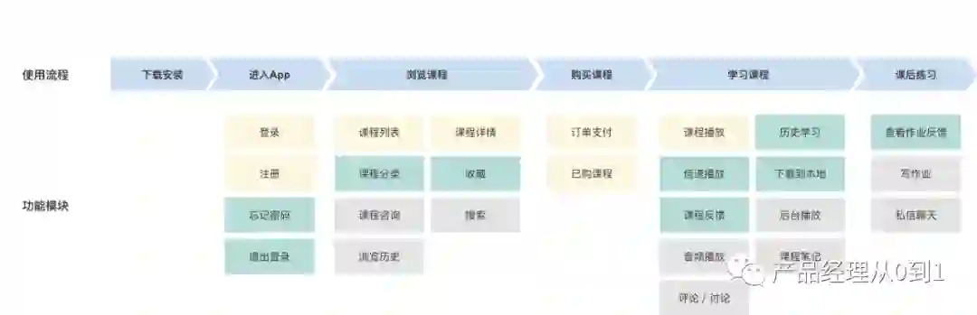 那用户的核心使用路径就是:下载安装——进入App——浏览课程——购买课程——学习课程——课后练习。