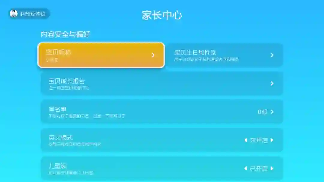 少儿模式下显示上会以明亮的色调为主,内容上都是儿童节目,还有轮播内容。比如我小外甥爱看的熊出没、芝麻街这些动画片甚至玩具视频都有。在儿童模式下还可以设置儿童锁,设置孩子的称呼、年龄等,有些不想看的节目可以设置黑名单,也可以开启纯英文模式帮助孩子成长学习。在保护眼睛方面可以设置单次使用时间、每天总时长,后期还会有降蓝光的护眼模式。