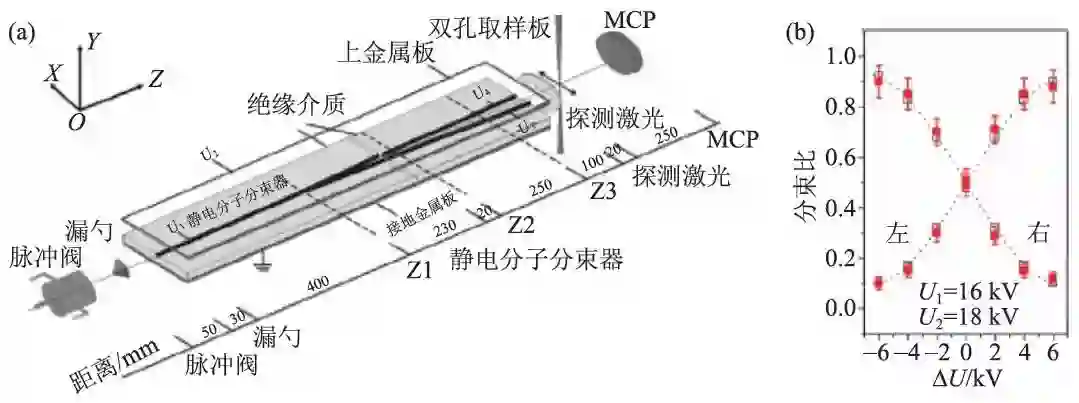 图4 冷分子静电表面分束的(a)实验装置与(b)结果