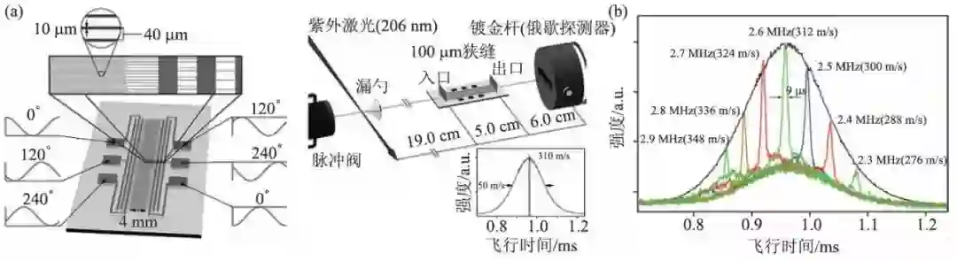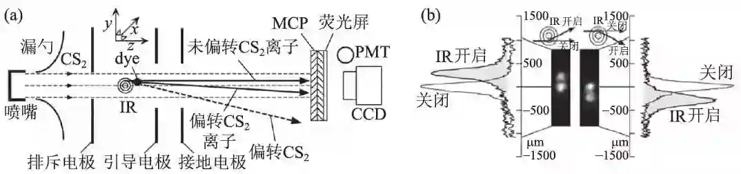 图7 分子束激光偏转、聚焦的(a)实验装置与(b)结果