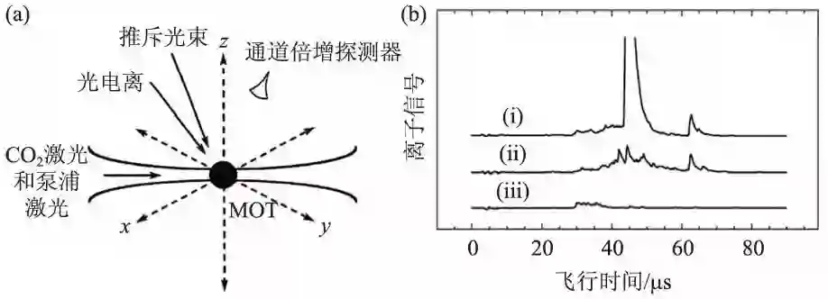 1998 年,Knize 小组首先报道了同核双原子Cs2分子的光学囚禁。在MOT中通过增加磁场的梯度来压缩磁光阱,提高阱中原子的密度。阱中的冷原子通过三体复合碰撞产生同核双原子Cs2分子,这些分子平动温度约为100 μK。然后,将这些Cs 原子和Cs2分子转移到由聚焦CO2 激光束形成的光阱中,实现其光学囚禁。最后,通过光致电离和TOF光谱技术来探测阱中的中性同核双原子Cs2分子。实验装置如图15(a)所示,CO2囚禁激光束和泵浦光束沿着同一方向重叠入射,MOT光束沿着图中虚线方向入射,再泵浦光束沿着x 方向入射。“pushing”(推斥)光束用于将原子从偶极阱中推出去,留下冷分子在光阱中。被囚禁的Cs原子和Cs2 分子通过脉冲的光致电离光束电离,最后通过多通道倍增管来探测。实验结果如图15(b)所示:曲线(i)为MOT 关掉后110 ms 观测到的TOF 离子光谱,图中大的信号峰和小的信号峰分别对应Cs+和Cs2+离子信号;曲线(ii)是当MOT关掉后,使用了一个“pushing”光束将光阱中的大部分原子移走时,在110 ms时阱中剩下的Cs+和Cs2+离子信号;曲线(iii)是MOT关掉后,没有使用CO2囚禁激光束,在110 ms 时阱中的背景离子信号。通过对阱中分子离子信号随时间变化的测量,他们推断冷分子在光阱的寿命大约为0.5 s,阱中分子的产生速率为600 s-1。