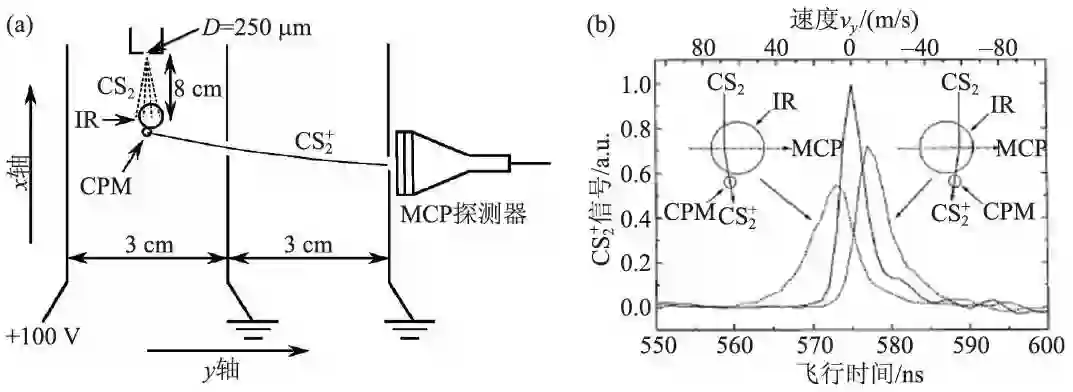 1997年,H. Stapelfeldt 等报道了利用非共振激光偶极力对分子进行偏转的实验,如图6 所示。一束脉冲的CS2分子束通过聚焦的红外光束(IR)焦点。实验通过对CS2 分子的多光子电离飞行时间质谱(TOF)探测发现,在非共振光学偶极梯度力的作用下,光束焦点附近的分子横向速度发生了改变,分子的运动方向产生了偏转。