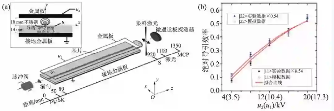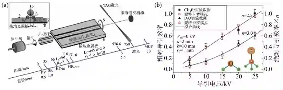 图2 冷分子芯片静电表面导引的(a)实验装置与(b)结果