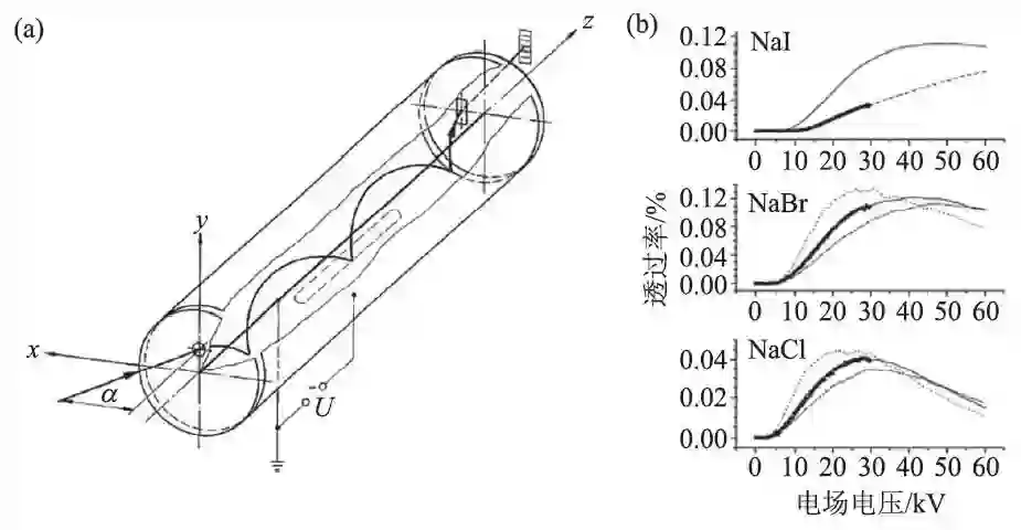 2000 年,德国Scheel 小组报道了强场搜寻态分子的静电导引。实验装置如图1 所示,由一根载荷直导线(接地)和一个圆柱形不锈钢管(加负电压)构成。当处于强场搜寻态的分子沿着某一角度进入非均匀静电场时,在垂直于z 轴的平面内作圆周运动,圆周运动的向心力由电场偶极力提供,而当分子圆周运动引起的离心力与静电场提供的向心力相平衡时,分子将沿着稳定的开普勒轨道作匀速圆周运动。由于轴向速度分量的存在,分子将环绕着电极作螺旋线运动,从而实现强场搜寻态极性分子的导引,即Kepler 导引。他们利用该装置实现了对NaCl、NaBr、NaI 三种极性分子的静电导引,导引距离约为40 cm,最高导引效率为0.12%。