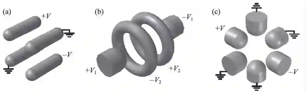 根据麦克斯韦的电磁场理论,在三维自由空间不存在静电场的最大值。但是在两维或一维空间是可以存在电场的极大值的。利用一个六极电场和一个偶极电场的叠加,可以在自由空间形成马鞍型的电场分布。在这种电场中,分子可以沿着一个方向被聚焦,沿着另一方向被散焦。通过改变四个电极上所加的电压,实现鞍型电场在两个方向的切换,从而改变分子聚焦与散焦的方向。如果这一切换过程被周期性的重复,并且分子接近鞍点时处于散焦电场中,而当分子离开鞍点时处于聚焦电场中,就会导致在所有的方向上对分子的平均聚焦效果。这种势阱被称为AC阱,既可用于囚禁强场搜寻态的分子,也可用于囚禁弱场搜寻态的分子。图8 给出了3 种AC阱的几何结构:(a)直线型AC阱;(b)圆柱型AC阱和(c)三相型AC阱。