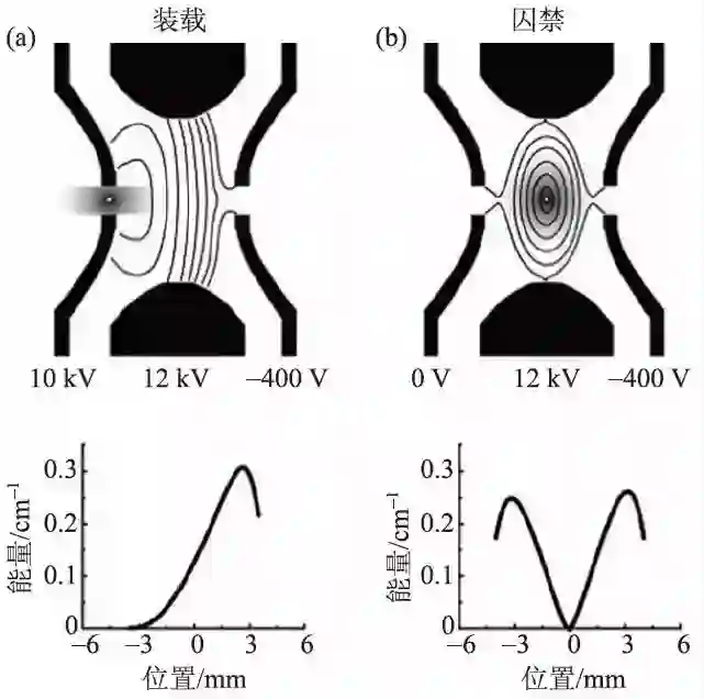 由于麦克斯韦的电磁场理论允许在三维自由空间存在静电场的最小值,因此弱场搜寻态分子的静电囚禁要相对容易得多。2000 年,Meijer 小组成功地将减速后的ND3分子囚禁在一个静电四极阱中。势阱横截面、空间电场强度等高线分布和ND3分子Stark 势能分布如图10 所示。在装载过程中,低速分子向着势阱中心运动,Stark 势能逐渐增加,运动的分子处于“爬坡”状态,速度越来越低,如图10(a)所示。当分子运动到势阱中心时,改变电极电压,势阱切换到囚禁状态,如图10(b)所示。实验结果表明,势阱中被囚禁分子的密度约为107 /cm3,体积约为0.25 cm3,势阱中分子温度约为25 mK。随后几年中,他们又分别将OH、亚稳态的CO以及NH囚禁在类似的势阱中。