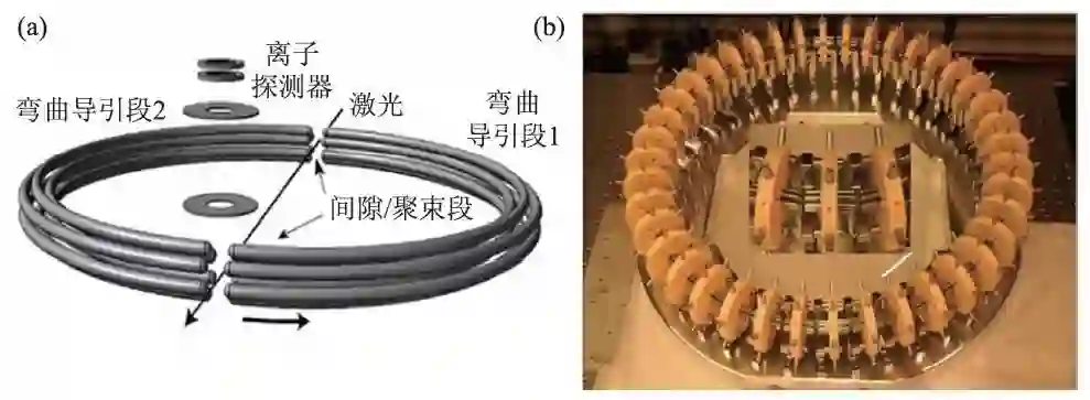 这种储存环的不足是对运动分子在纵向没有聚束效果。由于分子波包有一定的速度分布宽度,其在演化过程中会逐渐展宽,最终弥散在整个储存环中。解决该问题的方法是在环上开两个空隙,即将一个整环一分为二,变成两个半环,如图13(a)所示。当分子波包经过空隙时改变储存环上的电压来对分子进行纵向聚束,压缩分子波包的宽度,从而使分子波包在环内运动的圈数大大增加。这种结构的储存环也叫分子同步聚束器,由Meijer 小组于2007 年在实验上首次实现。如果将储存环分为更多小段,每个小段留有一定空隙用于对分子进行纵向聚束,那么这种储存环(或分子同步聚束器)可以同时储存多个分子波包,并且分子波包在空间运行的距离也将大大增加。2010 年,Meijer 小组采用如图13(b)所示的存储环装置,在实验上实现了长达1 英里以上的分子波包运行距离。