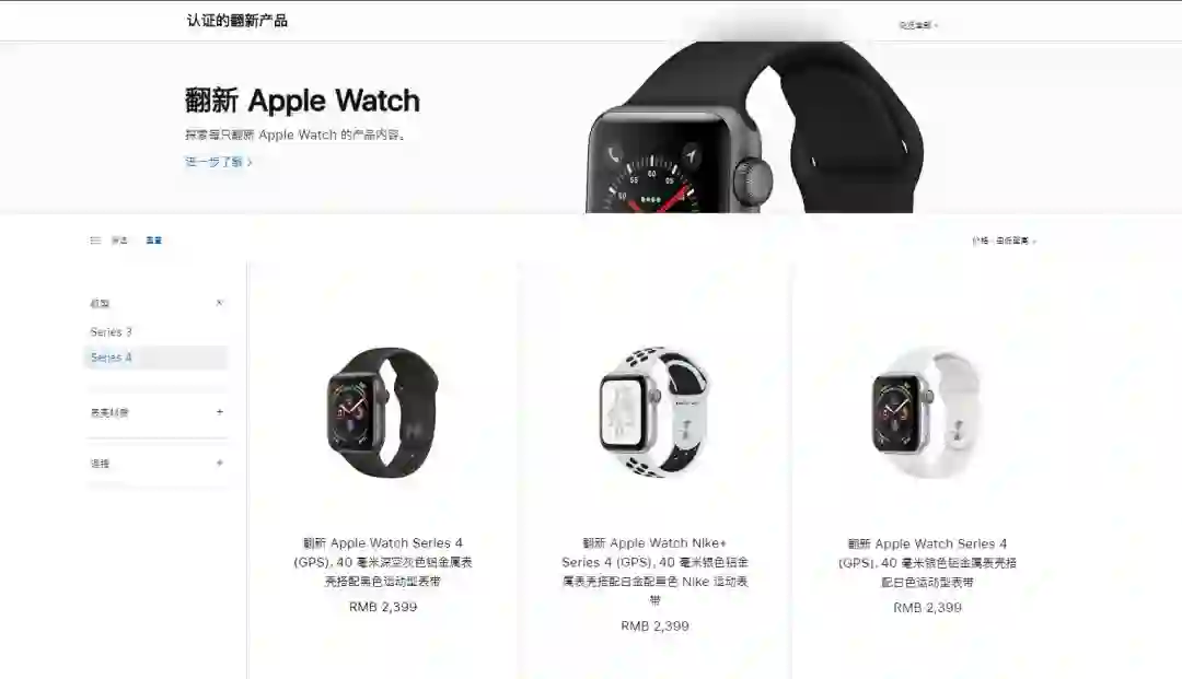 最近,苹果在线商店上架了多款翻新版 Apple Watch Series 4,包括 GPS 版本、GPS+蜂窝版本、Nike 版本,其中最便宜的款式价格为 2399 元,并且支持免息分期。