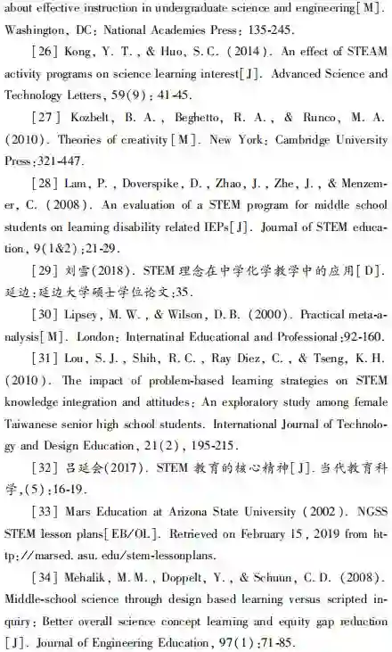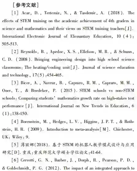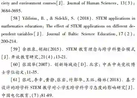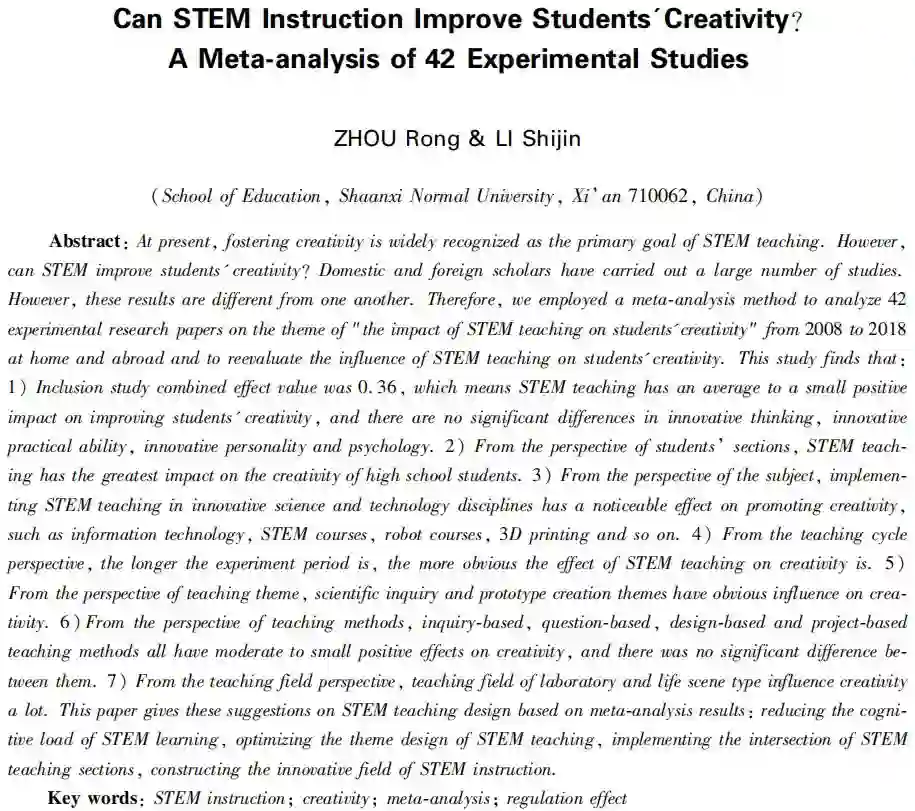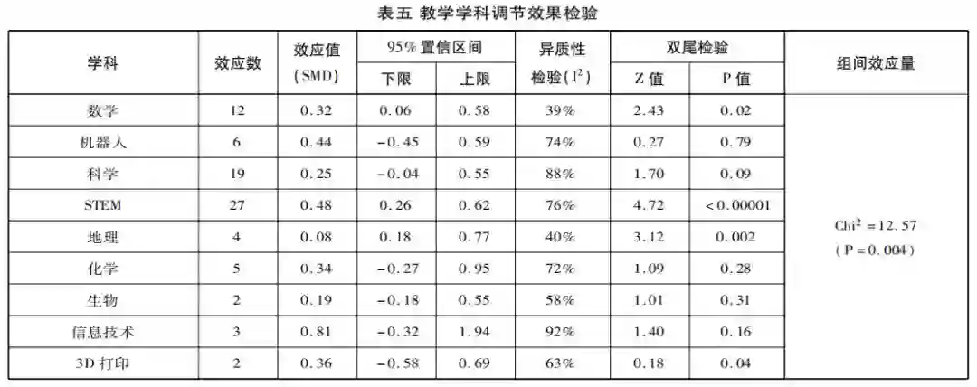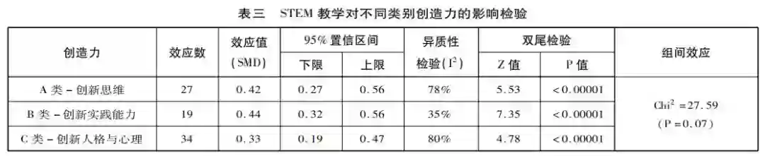第三种结论全面否定了STEM教学对创造力的影响。例如,卡维耶蒂等(Cervetti et al.,2012)以937名小学生为研究对象,开展以阅读理解、科学写作为主题的STEM教学结果显示,小学生的创造力没有显著变化。汤斯(Townes,2016)的研究同样表明,STEM教学并未显著提升初中生的学习态度、创造力水平。