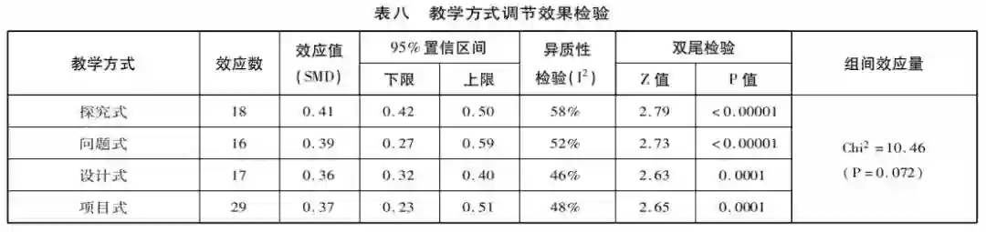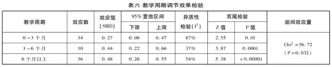 不同教学周期对创造力的调节作用差异显著,组间效应,P=0.032<0.05(见表六)。效应值排序显示,实验周期愈长,STEM教学对创造力的影响效果愈明显。持续6个月以上的教学,对创造力的提升作用达到中等程度(SMD=0.48);3-6个月的教学效果稍差(SMD=0.44);低于3个月的教学,创造力培养绩效仅达到较低水平(SMD=0.27)。这与罗宾逊等的研究结果一致,即学生创造力的受影响程度与教学周期正相关(Robinson et al.,2014)。