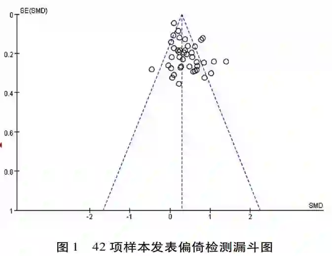 罗斯坦等强调,元分析样本出现发表偏倚时,会导致效应值远大于实验真实值,直接影响元分析结果的准确性和可靠性(Rothstein et al.,2006)。本研究采用漏斗图对42项样本进行发表偏倚检测。样本源均分布于漏斗图的上部有效区域,两侧数据对称且向中线靠拢,说明纳入的42项元分析样本科学有效,出现发表偏倚的可能性极小(见图1)。