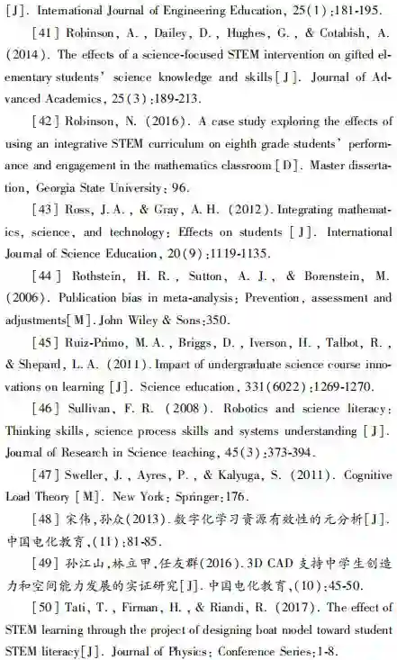 元分析结果同时表明,随着教学周期的延长,STEM教学对学生创造力的影响效果持续增加。因此,保持STEM课程内容和教学时间的连续,并关注学段衔接问题有重要意义。美国的经验为我们提供了两条可行之路:一是设立跨学段的STEM教学试验项目,如面向小学、初中和高中的项目引路(Project Lead The Way)以及面向初中、高中和大学的Ten80学生汽车挑战赛(Ten80 Student Racing Challenge)项目(CTEq,2013);二是构建跨学段的STEM连贯课程群,如亚利桑那州立大学联合宇航局开发的面向小学至研究生阶段的火星教育项目STEM课程(Mars Education at Arizona State University,2002),北卡罗来纳州科学和数学学校设立的贯穿初中、高中和大学等学段的精英课程等( NCSSM,2016)。