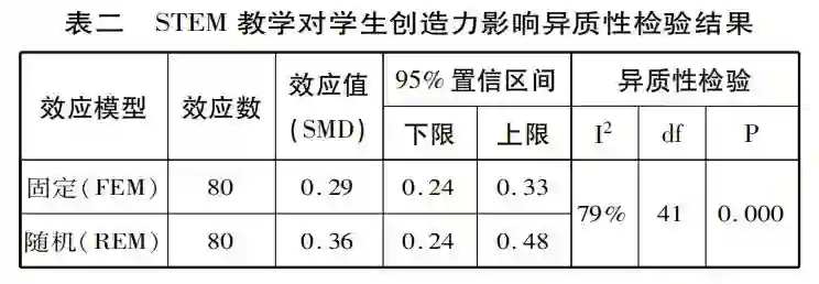 异质性检验是防止因存在异质性而无法合并效应值。研究采取统计量方法判断样本的异质性程度。通常,≥75%时采用随机效应模型,0≤≤75%时采用固定效应模型消除异质性,以防研究结果出现偏差(Borenstein et al.,2009)。42项元分析样本的异质性结果(见表二),故本研究采用随机效应模型消除样本的异质性,以保证分析结果的科学性。