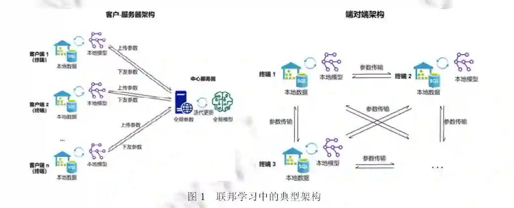 为了下文中概念统一、表述清晰, 本文将客户-服务器中的服务器称为中心服务器; 将客户-服务器中的客户端和端对端架构中的参与训练终端统称为终端; 所有参与训练的服务器、终端统称为参与方. 训练过程中发送的梯度、模型参数、嵌入式表示等, 统称为中间参数. 上述两种典型架构如图 1所示.