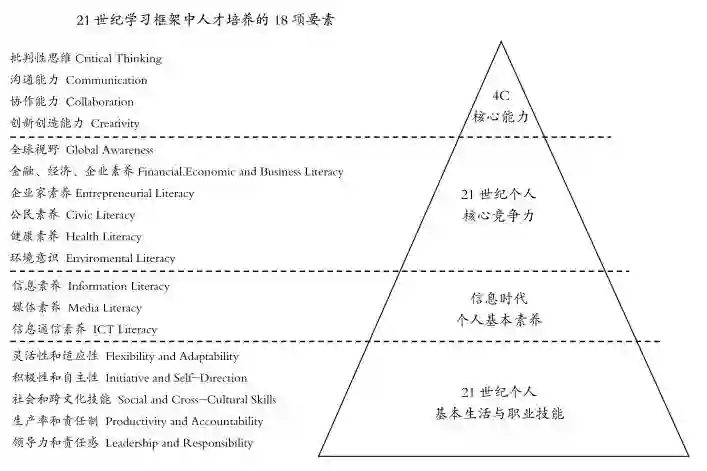 为了满足21世纪劳动力市场的需求,2002年,美国教育部与部分有社会影响力的企业成立了“21世纪技能联盟(P21)”,对21世纪美国公民应具备的技能,展开了整体而系统的研究,最终制定了基础教育 “21世纪学习框架”(Framework for 21st Century Learning),即美国“21 世纪核心素养”[11]。该框架提出未来人才需要具备的18项要素,如图1所示[12]。然而,人们逐渐意识到“21世纪学习框架”过于复杂,进而指出,“4C核心能力”是21世纪最重要的能力,也是未来人才培养的关键目标。