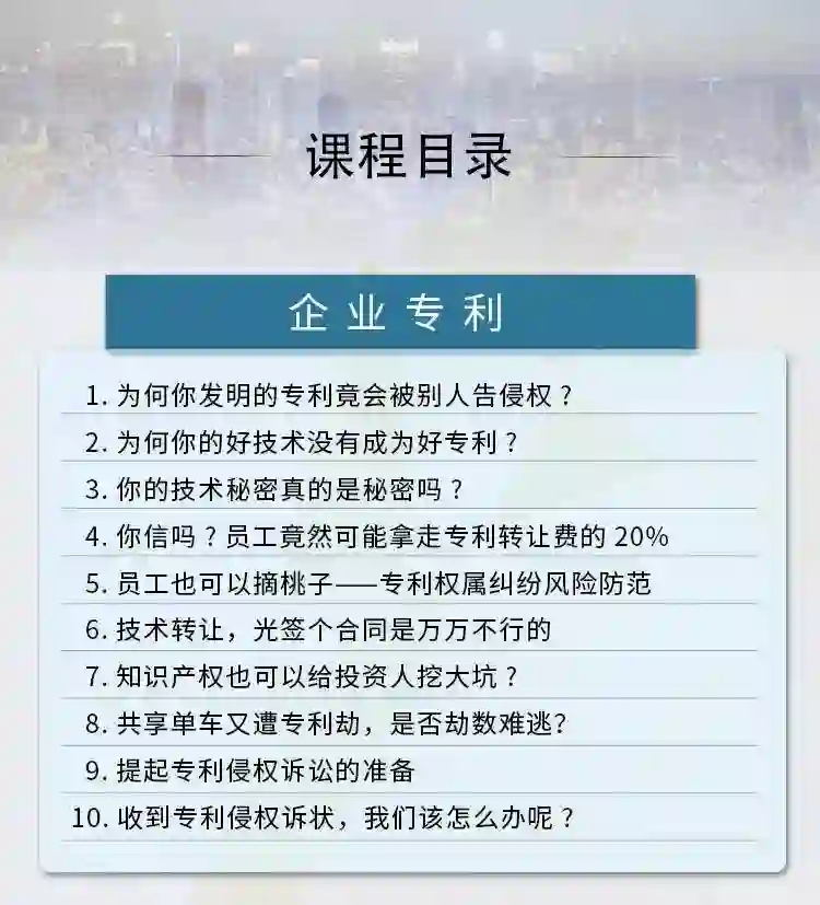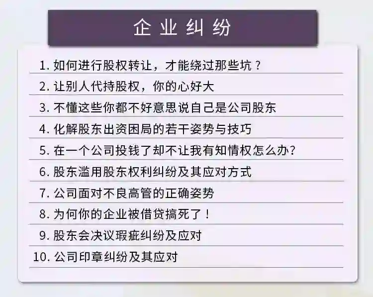 这门课程的每一位讲师都是身经百战的专业律师,他们将实战经验与经典案例相结合,把每一个枯燥的法律知识点讲得通俗易懂、妙趣横生,法律小白也能听得懂、记得住,是一门具备实用性的企业抗风险法律宝典。