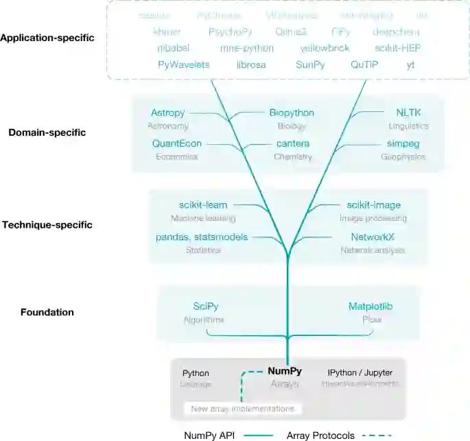 科学的 Python 生态系统建立在这个基础之上,提供了几个广泛使用的库,这些库反过来又构成了许多领域特定项目的基础。NumPy 是array-aware库生态系统的基础,它设置文档标准,提供数组测试基础设施,并增加对 Fortran 和其他编译器的构建支持。