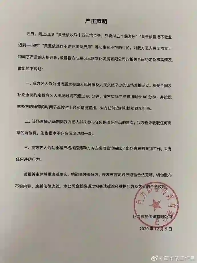 12月9日,针对此前媒体报道“黄圣依收10万坑位费,只卖出5个杯子”,黄圣依工作室发声明称其不实。该声明称,黄圣依未参与保温杯的售卖,也没有收取任何商家的坑位费。据媒体报道,某直播代运营平台在10月25日邀请了黄圣依合作直播,为某知名家电品牌的新品保温杯带货。从数据来看,黄圣依坑位费最贵,但是销售额最差的,仅卖出5个杯子,销售额695元。
