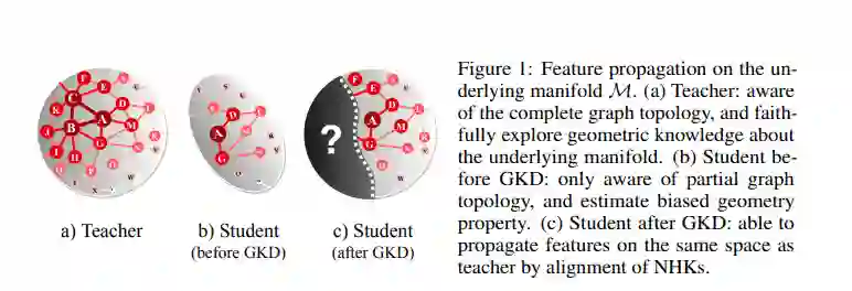 本文研究了一种知识迁移的新范式,旨在通过将知识从在完全图上训练的教师GNN模型提取到在更小或更稀疏的图上操作的学生GNN模型,将图拓扑信息编码到图神经网络(GNN)中。为此,我们回顾了热力学和GNN行为之间的联系,在此基础上,我们提出了神经热核(NHK)来封装与GNN体系结构有关的底层流形的几何特性。一个基本的和原则性的解决方案是通过对齐教师和学生模型的NHKs,称为几何知识蒸馏。我们开发了非参数实例化和参数化实例化,并在不同的实验设置中演示了它们的有效性,用于不同类型的特权拓扑信息和师生方案的知识蒸馏。