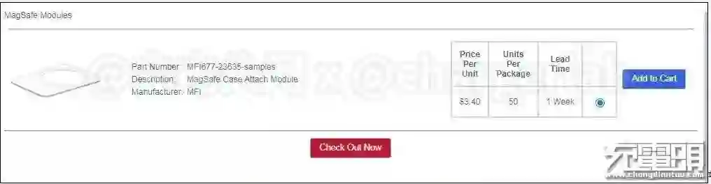 获得MFM认证之后呢,就可以通过苹果代理商安富利购买到MagSafe保护壳需要用到的磁吸模组,安富利官方后台显示,模组单价3.4美元(合计人民币约22.7元),购买50套模组的交期为一周。