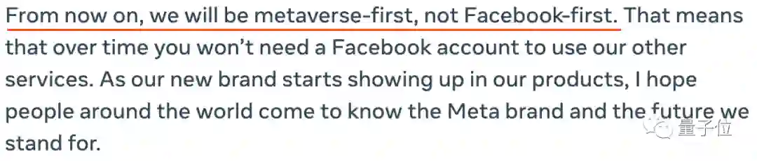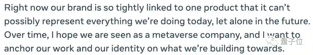 现在我们的品牌与一个产品紧密相连(指Facebook),但它不可能代表我们现在所做的一切工作,更不用说未来了。随着时间推移,我们更希望被看作是一个元宇宙公司,我希望我们的工作和身份被锚定在我们正在做的东西上。