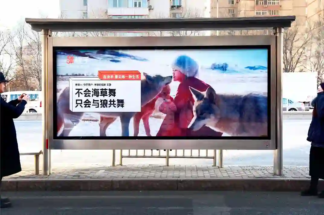最近两周,很多一线城市居民都发现,电梯视频广告中出现了一位号称“无用发明家”的胡渣大汉手工耿;而在小区门口的公交站灯箱上,一位身处北方雪国的姑娘坐在三匹狼中间,文案写着“不会海草舞,只会与狼共舞”——这一轮刷街广告投放,来自于活跃在老老少少屏幕中的快手。