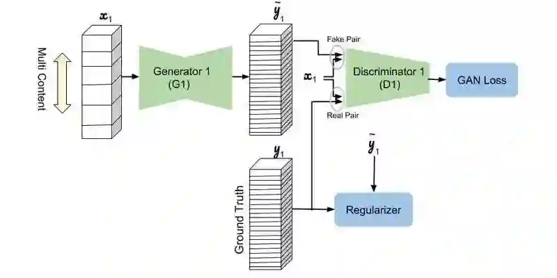 因此,就算只观察到少数几个字母的任何想要的字体,经过预训练的 GlyphNet 会根据这些字母的风格生成全部 26 个 A~Z 的字形。但是,我们应该如何实现风格迁移呢?第二网络 OrnaNet 采用这些生成的字形,Multi-Content GAN 对这些数据经过重复的转换,如下图中,用 T 表示灰度信道重复的步骤,之后 OrnaNet 再用 cGAN 生成满足预期的颜色和装饰。OrnaNet 的输入和输出是批量的 RGB 图像,而不是堆栈,其中每个字母的 RGB 通道,作为图像被反复填充进 GlyphNet 生成的相应灰度字形中。OrnaNet 中也被填进多个正则项(regularizer),用于弥补生成字母的掩码与相应字形的偏差。