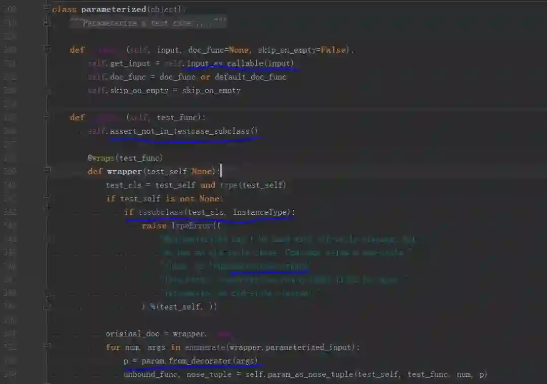 它提供了一个装饰器类 @parameterized,源码如下(版本 0.7.1),主要做了一些初始的校验和参数解析,并非我们关注的重点,略过。