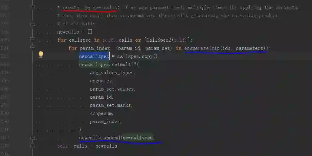 根据传入的参数对,它复制了原测试方法的调用信息,存入待调用的列表里。跟前面分析的两个库不同,它并没有在此创建新的测试方法,而是复用了已有的方法。在 parametrize() 所属的 Metafunc 类往上查找,可以追踪到 _calls 列表的使用位置: