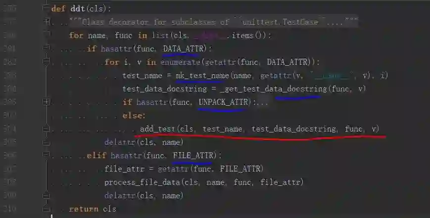 它们的共同作用是在类方法上 setattr() 添加属性。至于这些属性在什么时候使用?下面看看加在类上的 @ddt 装饰器源码: