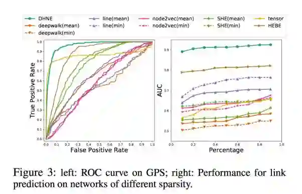 左:GPS网络中的ROC曲线;右:不同稀疏的连接预测性能