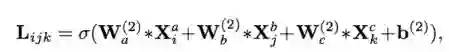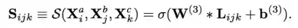 于一阶相似性,本文采用的是multilayer perceptron,分成两个部分。第一部分是模型框架中的第二层,这是个全连接层而且激活函数是非线性的。输入是三个节点(vi,vj,vk)(他们属于三个不同的节点类型a,b,c)的向量表示(Xai,Xbj,Xck)。作者把他们拼接起来,并且映射到统一的空间L。