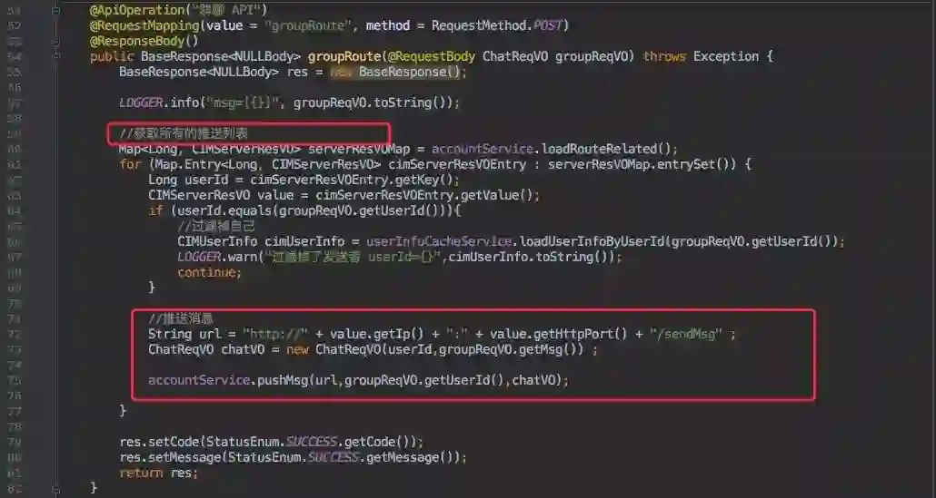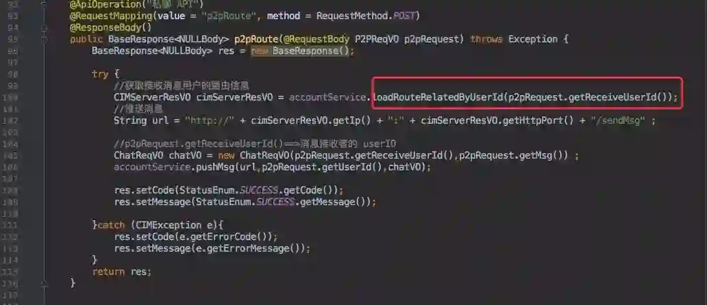 所以私聊接口在收到消息后需要查询到接收者所在的 cim-server 实例信息,后续的步骤就和群聊一致了。调用接收者所在实例的 HTTP 接口下发信息。