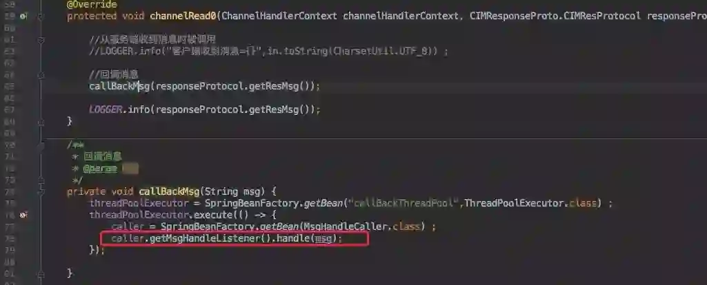 因此先创建了一个 Caller 的 Bean,这个 Bean 中包含了一个 CustomMsgHandleListener 接口,需要自行处理只需要实现此接口即可。