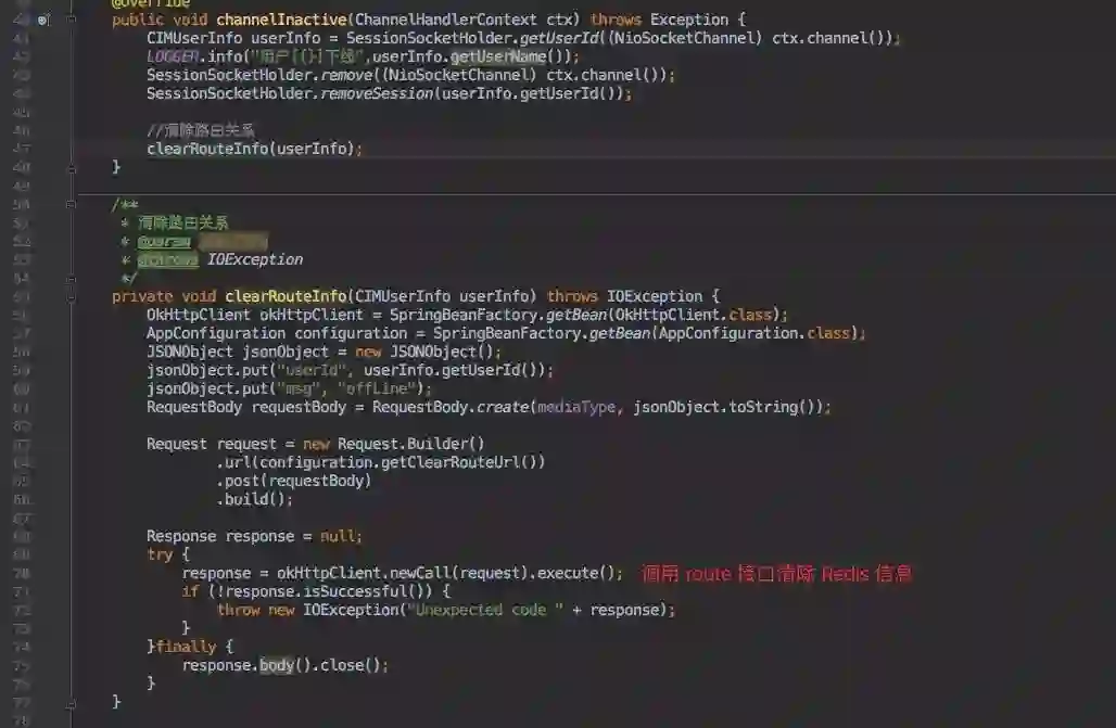 一旦客户端下线,我们就需要将之前存放在 Redis 中的一些信息删除掉(路由信息、登录状态)。