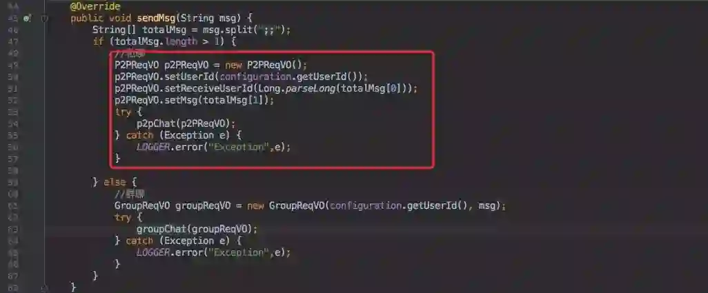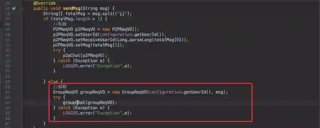 只是群聊是遍历所有的在线用户,私聊只发送一个的区别。