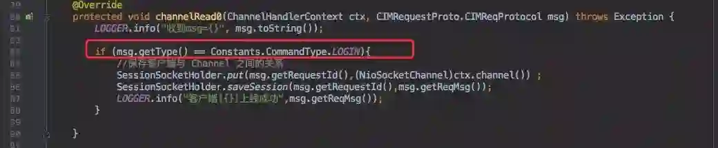 这时客户端会发送一个特殊报文,表明当前是登录信息。服务端收到后就需要将该客户端的 userID 和当前 Channel 通道关系保存起来。