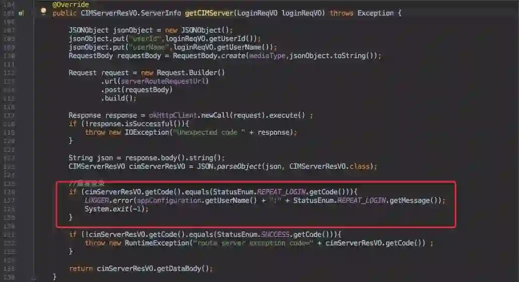 登录过程中 Route 接口会判断是否为重复登录,重复登录则会直接退出程序。
