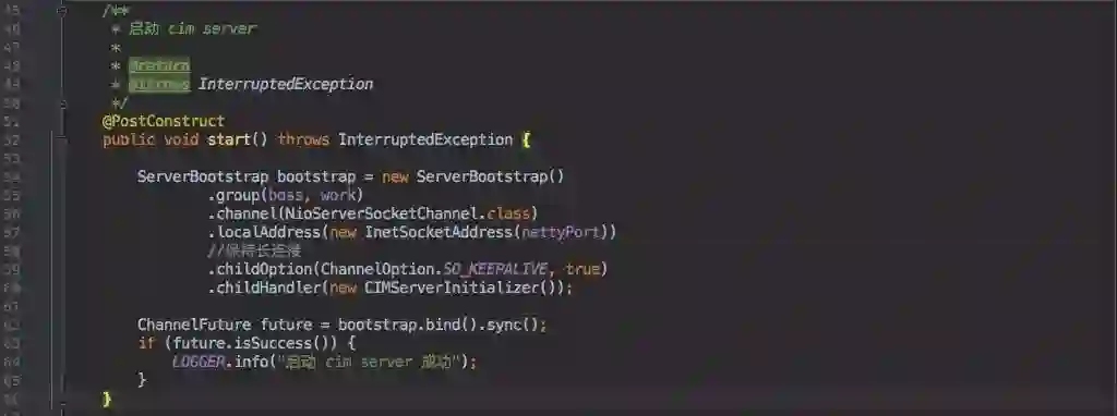 由于是在 Spring Boot 中搭建的,所以在应用启动时需要启动 Netty 服务。