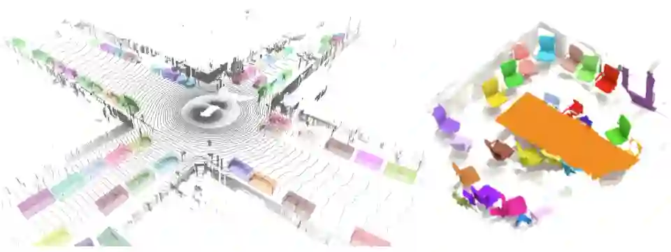 下图(左)为 TF 3D 库中 3D 目标检测模型在 Waymo Open 数据集帧上的输出示例;下图(右)为 TF 3D 库中 3D 实例分割模型在 ScanNet 数据集场景上的输出示例。