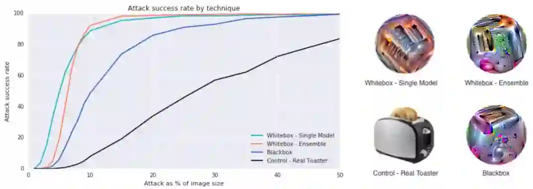 这种攻击方式有重大意义,因为攻击者构建攻击时不需要知道所攻击的图像是什么。对抗 patch 被生成之后,可以在互联网上广泛传播,其他攻击者也可以打印和使用。此外,这种攻击使用了大幅度的扰动,而现存的防御小幅度扰动攻击的技术可能无法泛化到大幅度扰动的攻击。实际上,最近的研究表明在 MNIST 上进行对抗训练的当前最佳模型(相比使用不同的距离度量搜索邻近对抗样本进行训练,或在背景中应用大幅扰动进行训练),面对大幅度扰动攻击时仍然很脆弱。