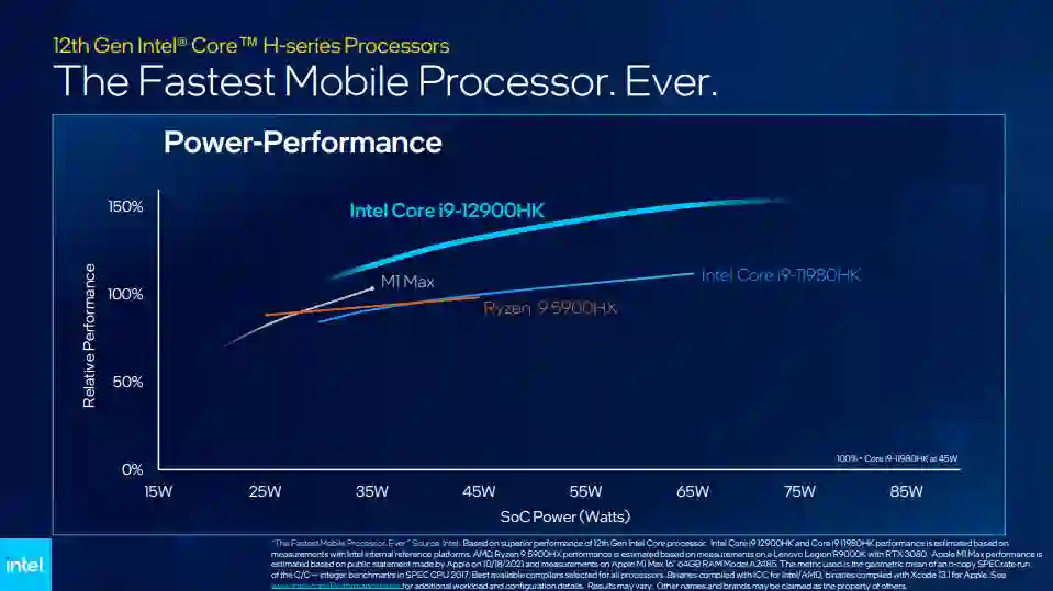 这次,英特尔非常“贴心”地减轻了许多芯片测评网站的工作量,直接官方下场,将其酷睿 i9-12900HK 与 M1 Max 和 AMD 锐龙 9 5900HX 进行对比: