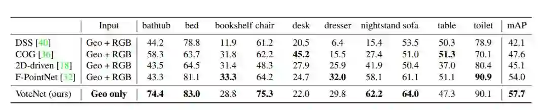 我们在两个具有挑战性的3D目标检测数据集上评估了我们的方法:SUN RGB-D数据集和ScanNet数据集。在这两个数据集上,仅使用几何信息的VoteNet明显优于使用RGB和几何甚至多视图RGB图像的现有技术。我们的研究表明,投票方案支持更有效的上下文聚合,并验证了当目标中心远离目标表面时,VoteNet能够提供最大的改进。