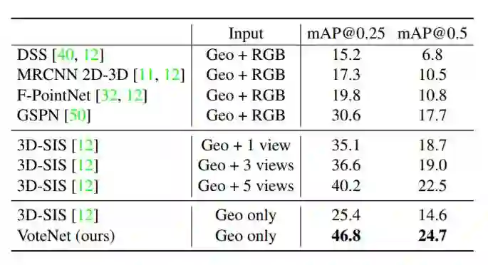 表2表明,仅使用几何输入时,我们的方法显著优于基于3D CNN的3D-SIS方法,超过了20 AP。