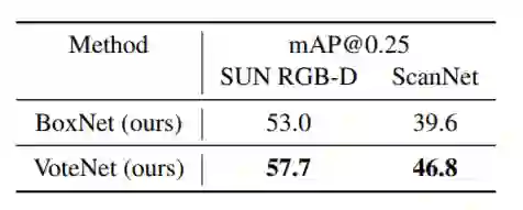 表3显示,在SUN RGB-D和ScanNet上,相比BoxNet,投票机制的网络性能分别提高了7 mAP和~5 mAP。