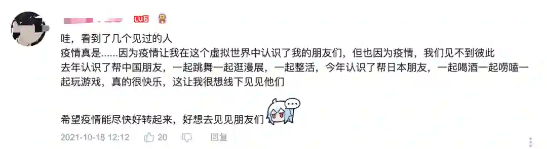 「哇,看到了几个见过的人疫情真是......因为疫情让我在这个虚拟世界中认识了我的朋友们,但也因为疫情,我们见不到彼此。去年认识了帮中国朋友,一起跳舞一起逛漫展,一起整活,今年认识了帮日本朋友,一起喝酒一起唠嗑一起玩游戏,真的很快乐,这让我很想线下见见他们。希望疫情能尽快好转起来,好想去见见朋友们。」