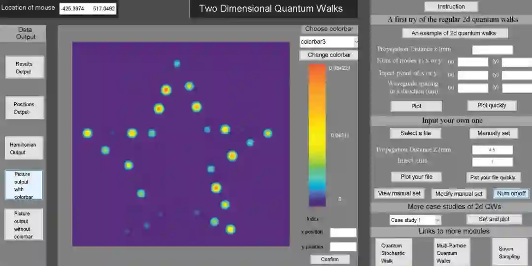 在可自由设计的量子行走模块中,用户可以设定常规的方形阵列结构,自由设定水平竖直方向的波导数目、水平竖直波导间距,以及指定入射的波导和演化长度。