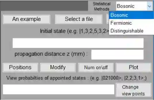 虽然光子是一种玻色子,在光量子芯片中,通过一定的相位调控方法,也可以模拟费米子等其他粒子,将量子模拟应用于更广泛的物理问题中。因此,在多光子量子行走模块中,用户可以选择这些多粒子是可区分的经典粒子 (Distinguishable)、不可区分的玻色子 (Bosonic) 和不可区分的费米子 (Fermionic)。